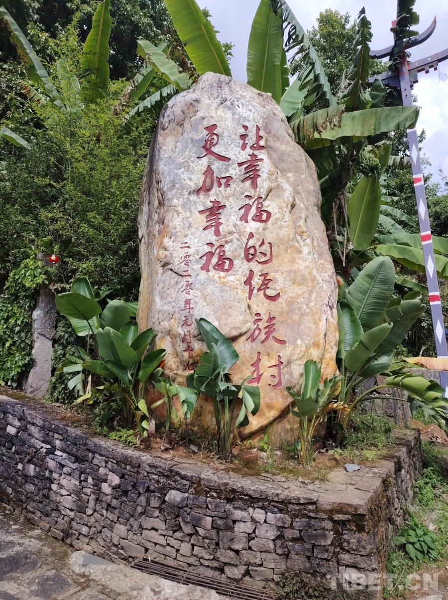 圖為司莫拉佤族村村口“讓幸福的佤族村更加幸?!笔填}詞。攝影:王東
