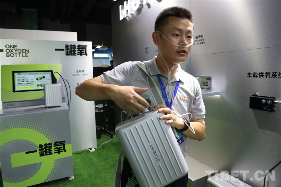 圖為318自駕游全國裝備展銷會(huì)上的工作人員正在講解如何使用高原上的氧氣背包 攝影:王妍丹
