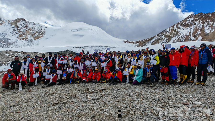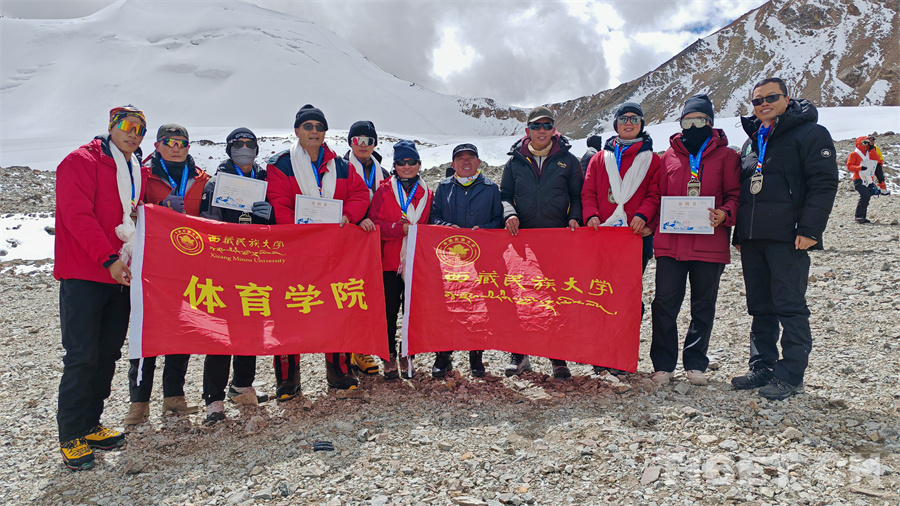 圖為2024第二十一屆中國西藏登山大會西藏民族大學(xué)部分師生登頂洛堆峰后合影留念,左四為楊建軍教授 攝影:馮重霖