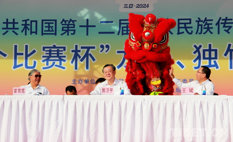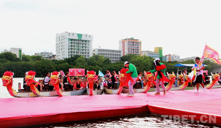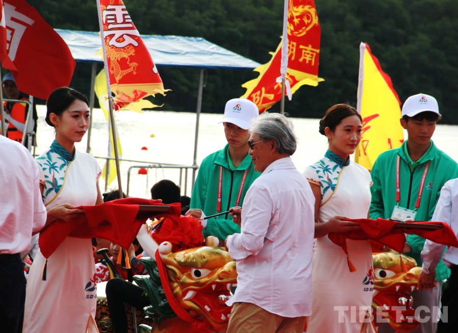 賽前,在龍舟巡游活動后,國家民委副主任郭衛(wèi)平,海南省委常委、宣傳部部長王斌,香港代表團顧問、中國香港體育協會暨奧林匹克委員會會長霍震霆,香港代表團團長,香港文化體育及旅游局體育專員蔡健斌,國家民委文化宣傳司司長張謀,國家民委港澳臺辦公室主任魏國雄,海南省政府副秘書長國章成,國家民委文化宣傳司副司長張劍輝,國家民委港澳臺辦公室副主任趙靜,海南省民委副主任黎梁東,海南省旅文廳副廳長王忠云,海南省三亞市政府副市長張長豐為龍舟點睛、披紅,將比賽氛圍烘托得格外喜慶熱烈。