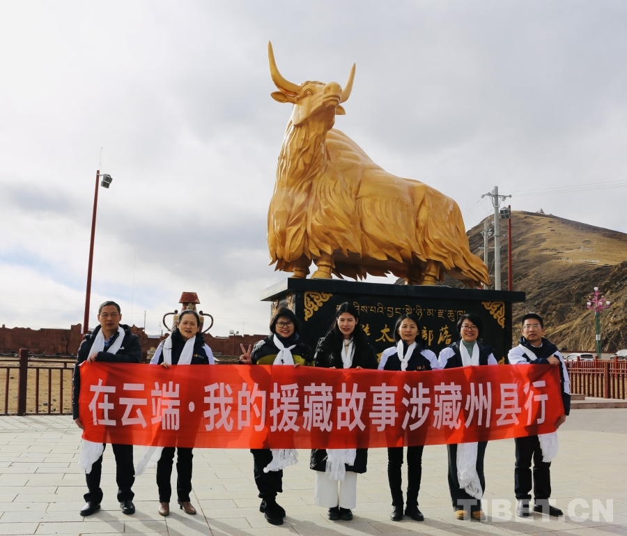 圖為宣講團援藏干部代表在石渠縣金牦牛雕塑前合影留念 攝影:龍真多吉