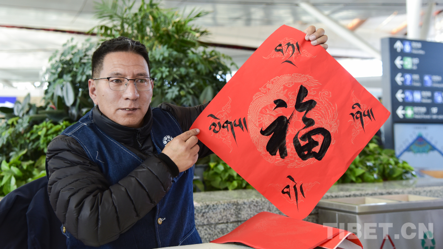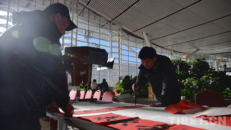 拉薩貢嘎國際機場內,映入眼簾的是航站樓二樓大廳里“點亮夢想 為愛起航”——西藏自治區(qū)文藝志愿服務活動走進貢嘎國際機場航站樓巨型廣告牌,藍天白云、雪山航線的畫面充滿了文藝范兒,格外醒目,吸引了不少旅客的目光。大廳西側的志愿者們現(xiàn)場揮毫潑墨,為旅客書寫寓意吉祥的“?!弊趾驮⒁庾85摹霸鞯吕铡?,并將這些蘊含著美好祝愿的書法作品免費贈送給旅客,為他們的旅途增添了更多的溫暖和祝福。