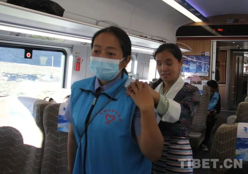 圖為“三站一途 天路導(dǎo)航”團隊在高原復(fù)興號上幫助視障旅客