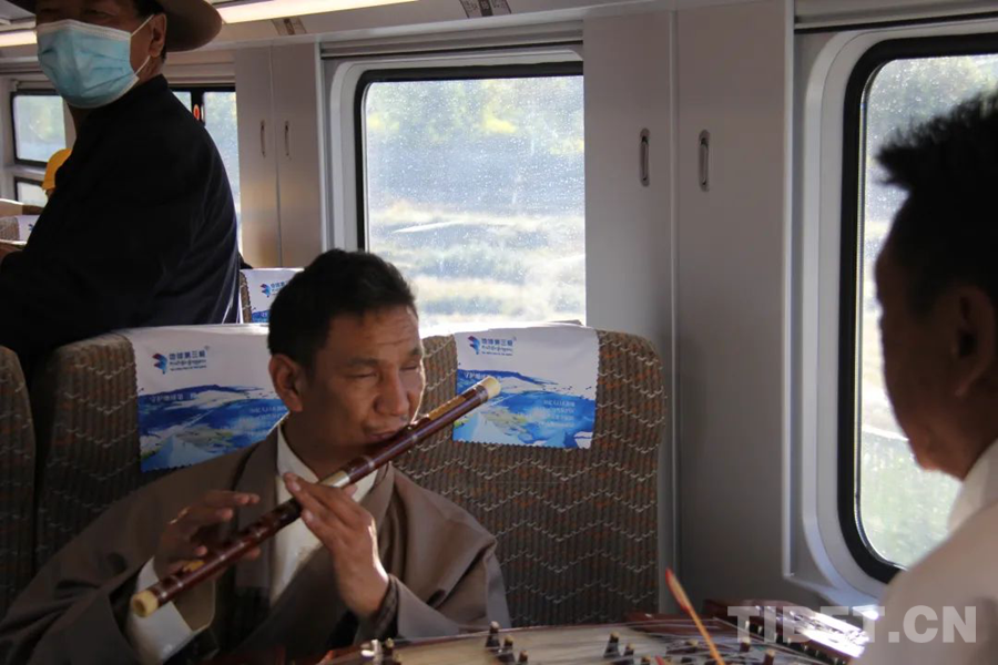 圖為在拉林鐵路開通運營1周年之際,“咔噠嘎布”樂隊受邀在高原復(fù)興號上表演