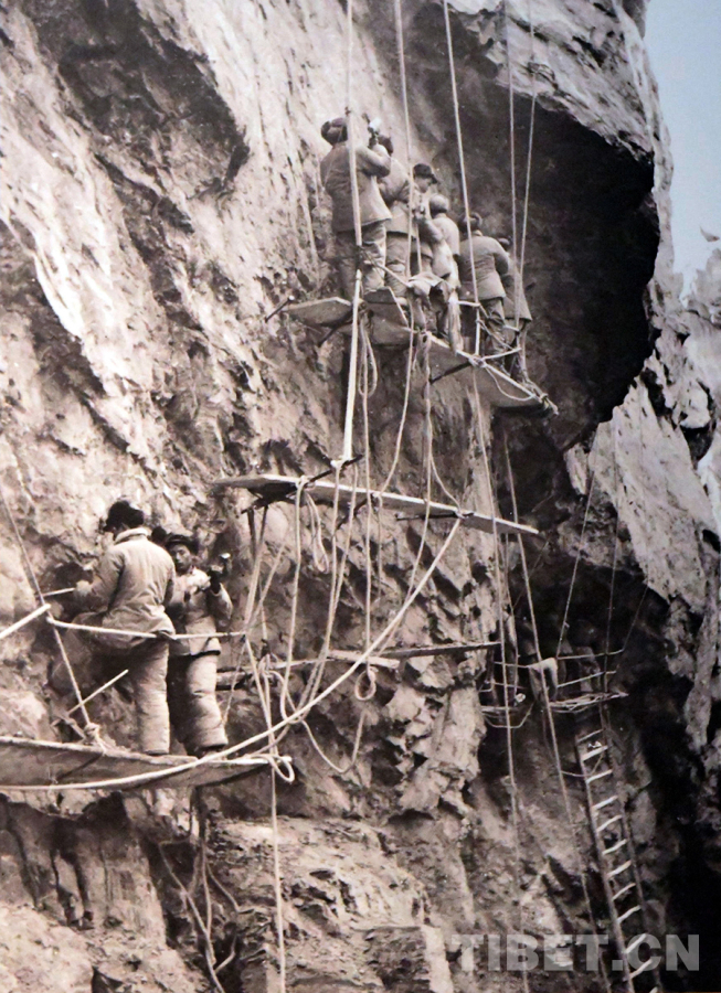 圖為“背著公路進(jìn)西藏”的十八軍戰(zhàn)士在懸崖上修筑川藏公路 唐召明翻拍