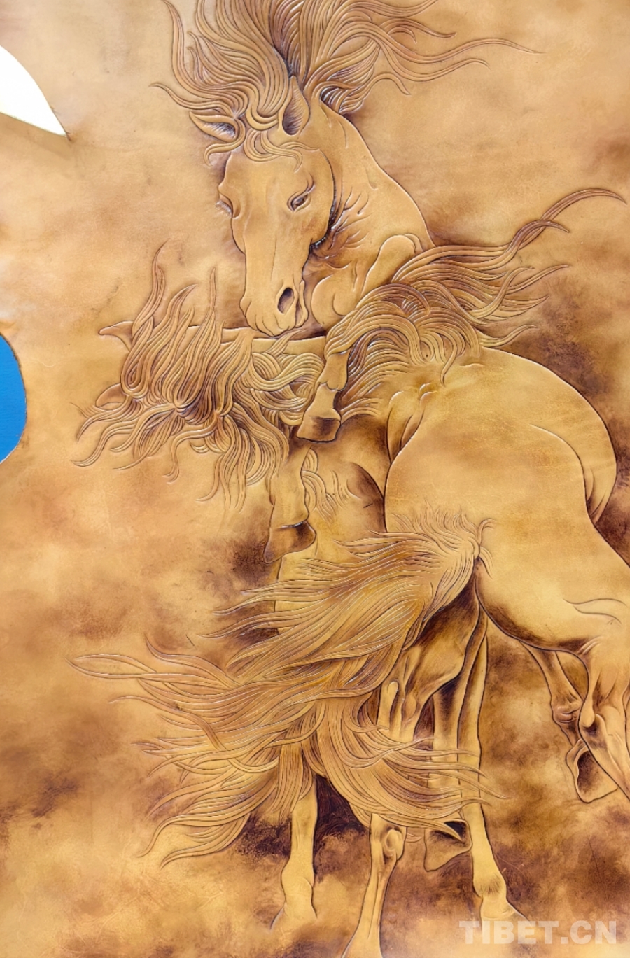 圖為多縣長江一號牧場參展的牛皮雕刻畫《青海雙驄》