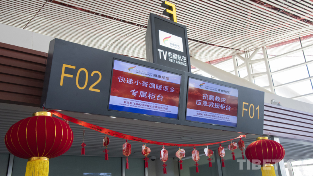 圖為西藏航空開設(shè)的快遞小哥溫暖返鄉(xiāng)專屬柜臺和抗震救災應急救援柜臺 攝影:趙振宇