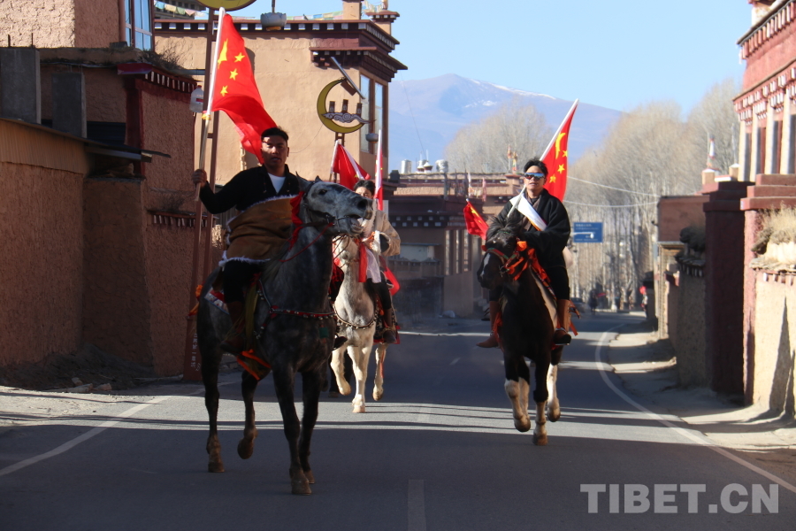 縣城新時代文明實踐廣場上擺放著“中華民族一家親,共度中國吉祥年”的藏式切瑪盒,馬術巡游隊伍繞行象征幸福安康的切瑪盒,祈愿風調雨順、五谷豐登,祝福祖國繁榮昌盛。
