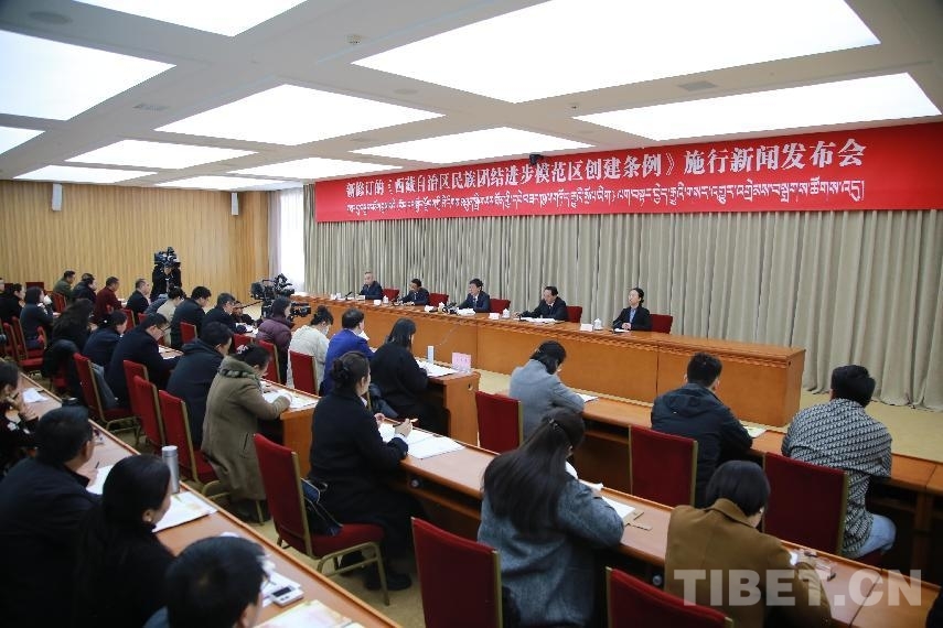 新修訂的《西藏自治區(qū)民族團結進步模范區(qū)創(chuàng)建條例》施行新聞發(fā)布會現(xiàn)場。攝影:趙釗