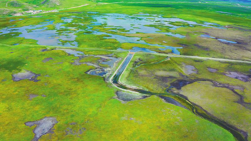 公路兩旁,青草織就的綠色地毯不斷鋪展,望不到邊,不時還能見到一個個水凼、沼澤或湖泊。這樣的景象,與2019 開始進場施工的若爾蓋濕地保護與恢復工程密不可分。措施之一,就是將之前開挖的排水渠填上,同時修建新的攔水壩蓄水。去年7月通過驗收的這項工程,總投資8880萬元,累計填堵排水溝35公里,恢復濕地水位6處,恢復濕地區(qū)域植被 6400 公頃,設置圍欄 78 公里。