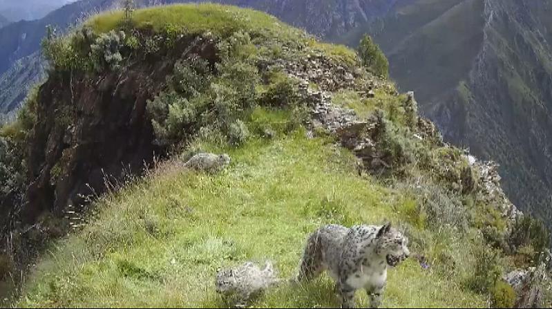 據(jù)了解,雪豹出現(xiàn)的地方距離曲麻萊縣城大概80公里左右,視頻中,雪豹媽媽先是出現(xiàn)在了鏡頭前面,過了一會之后,兩只小雪豹從草叢中“躡手躡腳”跑了出來,樣子十分可愛,隨后在雪豹媽媽的帶領(lǐng)下,三只雪豹消失在了鏡頭前。當(dāng)?shù)厣鷳B(tài)環(huán)境部門工作人員告訴記者,除了這次紅外相機拍攝到雪豹蹤跡,在前段時間,距離三只雪豹出現(xiàn)三十多公里的地方,還拍攝到了另一只在夜間活動的雪豹,畫面中這只雪豹嘴里叼著獵物,背對著走過紅外相機鏡頭。