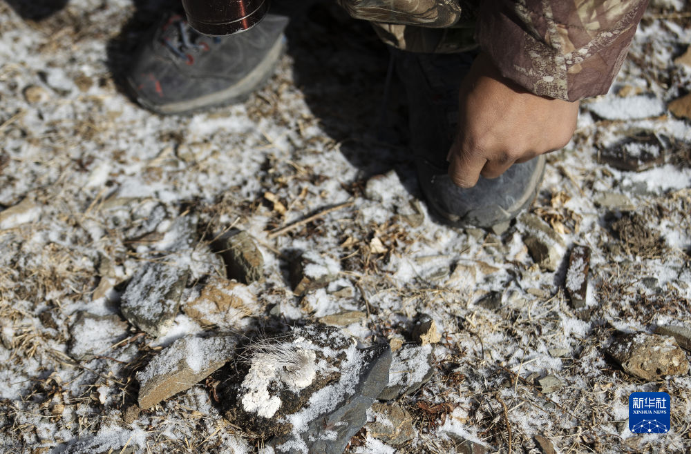 2月21日,更求曲朋在昂賽大峽谷里巡護(hù)時查看巖羊留下的毛發(fā)。新華社記者 費茂華 攝