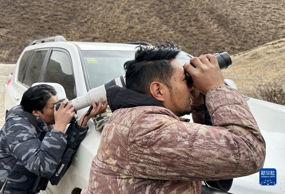2月21日,更求曲朋(右)和才仁尼瑪在昂賽大峽谷里觀察遠(yuǎn)處的雪豹。新華社記者 費茂華 攝