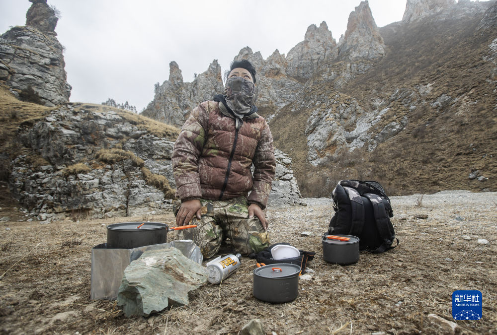 2月21日,更求曲朋在昂賽大峽谷里一邊做飯,一邊查看遠(yuǎn)處山上的情況。新華社記者 費茂華 攝
