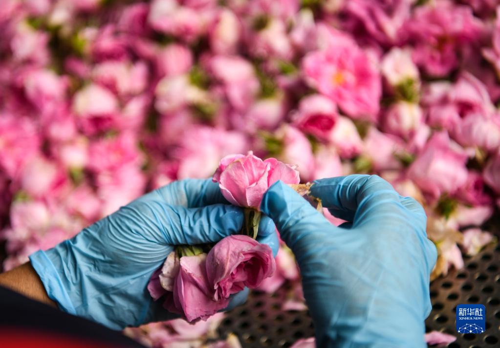 6月15日,在四川省阿壩州小金縣“金山玫瑰”基地,工人將玫瑰花干花裝袋。新華社記者 王曦 攝