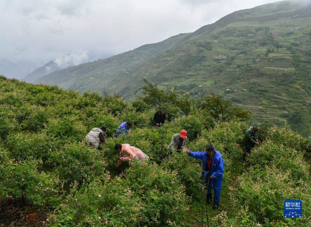 6月14日,在四川省阿壩州小金縣新橋鄉(xiāng)共和村,當(dāng)?shù)胤N植戶在采摘玫瑰鮮花。新華社記者 王曦 攝