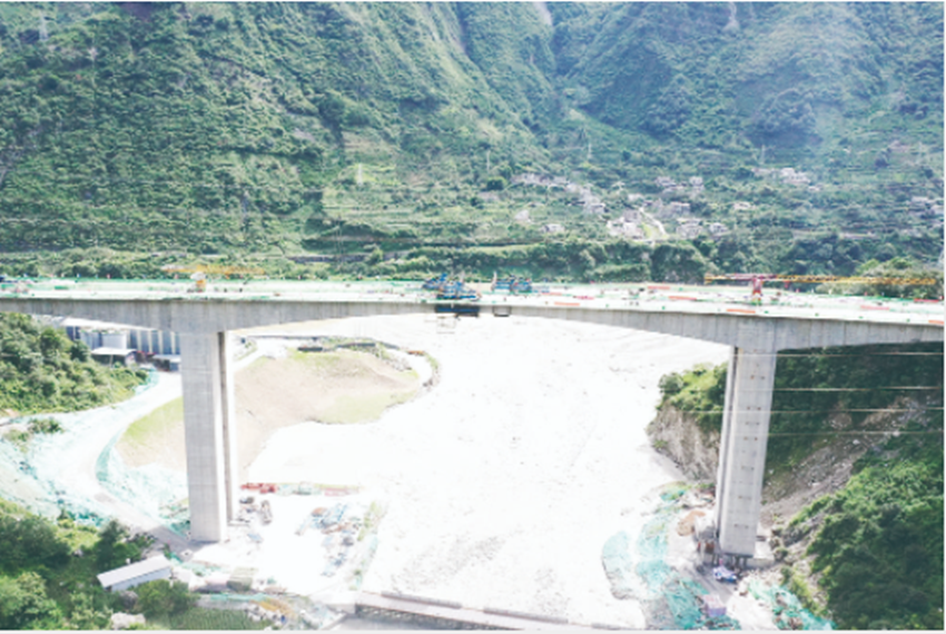 金光特大橋是瀘石高速公路全線控制性工程之一,該橋全長(zhǎng)450米,最高墩高67米,位于甘孜州瀘定縣得妥鎮(zhèn)金光村境內(nèi)。大橋所在位置海拔高度1105米,年均氣溫15.7℃,晝夜溫差大,混凝土膠凝材料施工質(zhì)量要求高。此外,金光特大橋跨越得妥鎮(zhèn)磨西河,該河谷為瀘定縣典型泥石流沖溝,總體施工技術(shù)難度偏大。