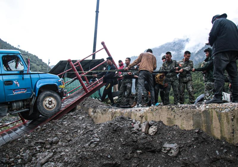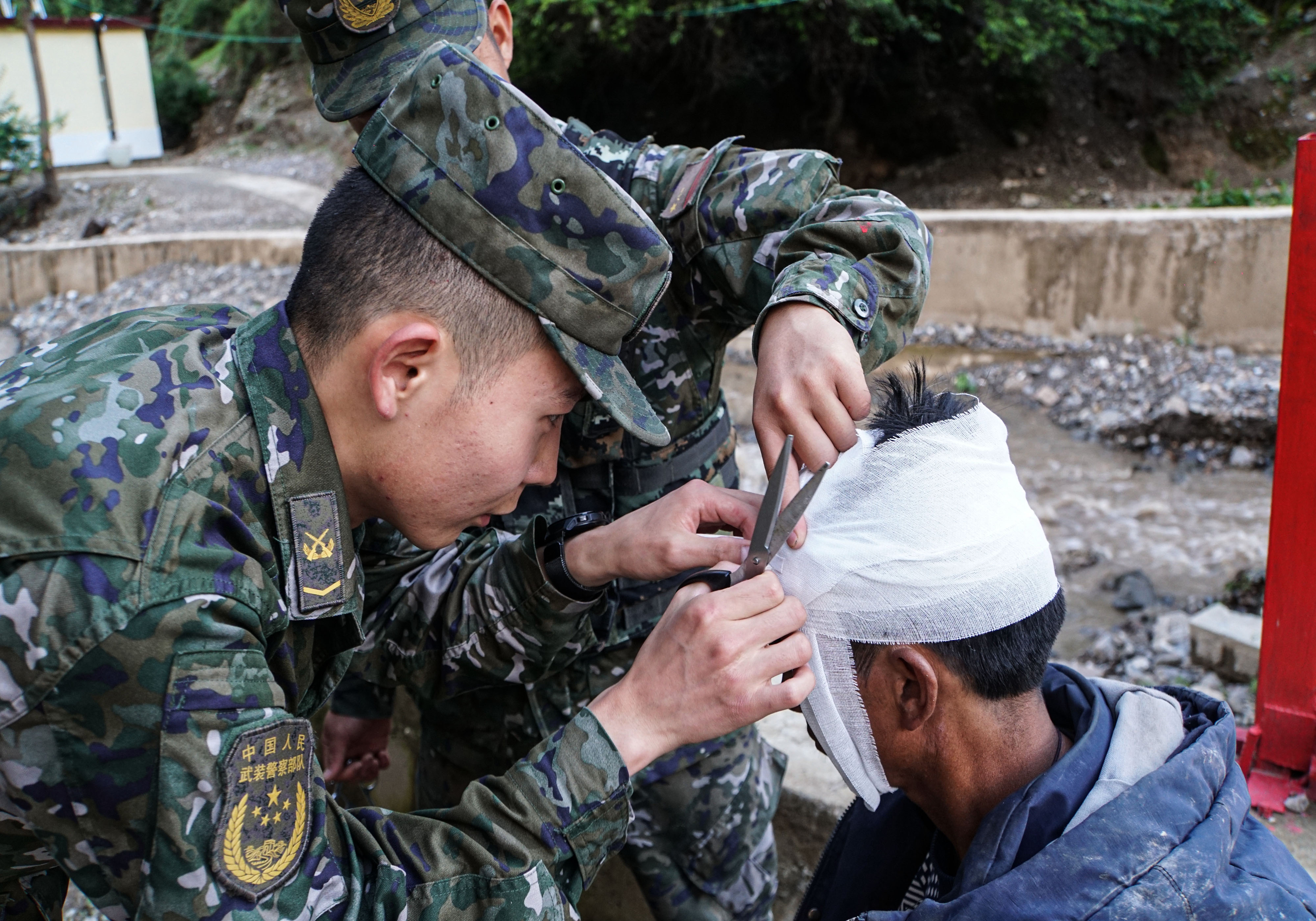 “同志,不要怕,我們是武警官兵,我們先給你處理傷口?!?甕云飛一邊安撫受傷群眾的情緒,一邊為他消毒止血、包扎傷口。后經(jīng)檢查,該群眾除了頭部有輕微皮外傷外,全身并無(wú)大礙。之后,中隊(duì)官兵又和當(dāng)?shù)厝罕娨黄鹜度胲囕v緊急救援,經(jīng)過(guò)幾個(gè)小時(shí)的努力,大家齊心協(xié)力將貨車拖至安全地帶。
