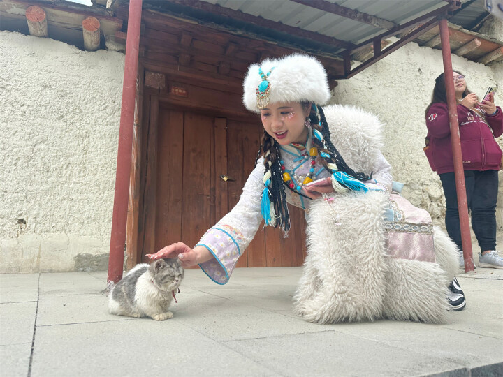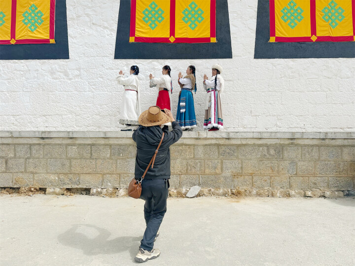 在景區(qū)內(nèi),隨處可見身穿藏族服飾、化上高原紅曬傷妝的游客們變身“扎西和卓瑪”,攝影師圍著她們忙前忙后,快門聲此起彼伏?!班?,好”“就是這樣,保持笑容”“下巴揚(yáng)起來”……在攝影師的引導(dǎo)下,““扎西和卓瑪””變換著姿勢(shì),拍下一張張景區(qū)打卡照。