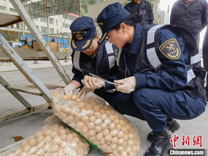 圖為2023年,拉薩海關(guān)所屬聶拉木海關(guān)關(guān)員監(jiān)管驗(yàn)放出口農(nóng)產(chǎn)品。資料圖 拉薩海關(guān)供圖